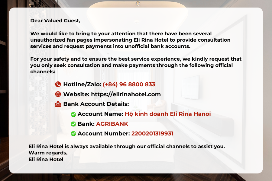 Eli Rina is an urban oasis conveniently situated in the heart of Hanoi City. With its contemporary luxury design, authentic culinary experience and outstanding hospitality services, Eli Rina boasts a respite from the hustle and bustle of life, offering guests with the seamless and relaxing stay.